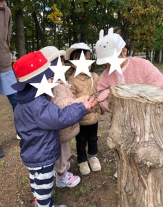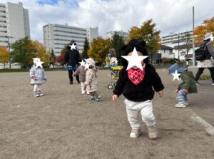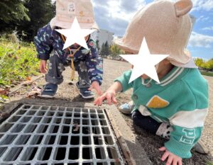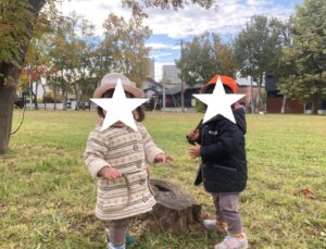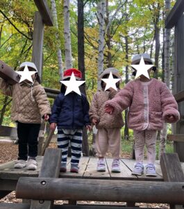 公園では元気いっぱい走り回り、どんぐりや木の実、落ち葉、秋の虫などを探しながら、たくさんの自然に触れ楽しんでいます。